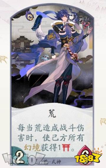 荒最明显的优点是多段伤害和协战能力,在幻境中的输出相当可观-2。他拥有所有SSR中最高的攻击面板,S级的防御也让他在输出式神中算是比较硬的存在-2。当然,技能特效炫酷这一点也不容忽视,毕竟“帅是一辈子的事”-2。